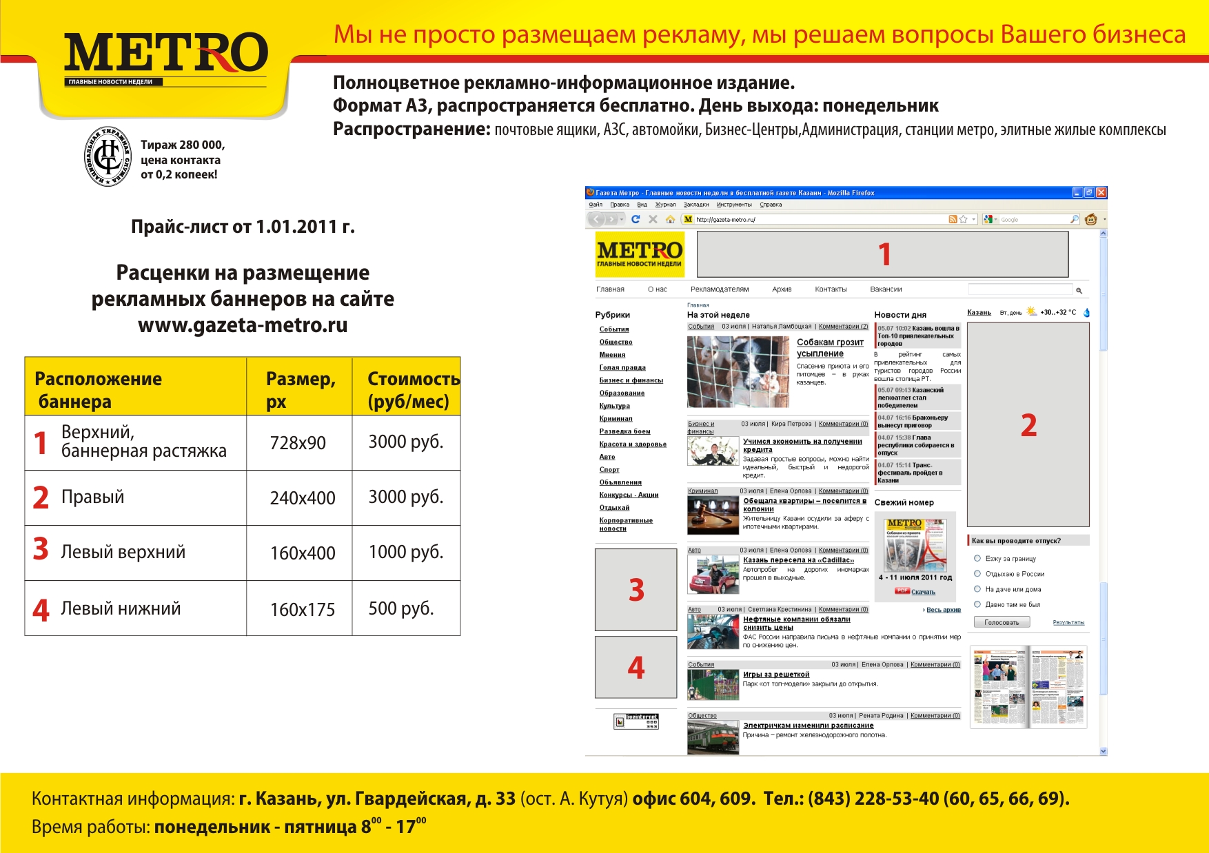 Газета "Метро. Главные новости недели" - это еженедельное бесплатное полноцветное издание формата А3. Это 20 полос, наполненных городскими новостями, эксклюзивными авторскими материалами на волнующие жителей Казани темы: новости Политики и Бизнеса, Финансы, Социальные проблемы, Образование, Авто, Здоровье, Моя Семья, Модный дом и многое другое.