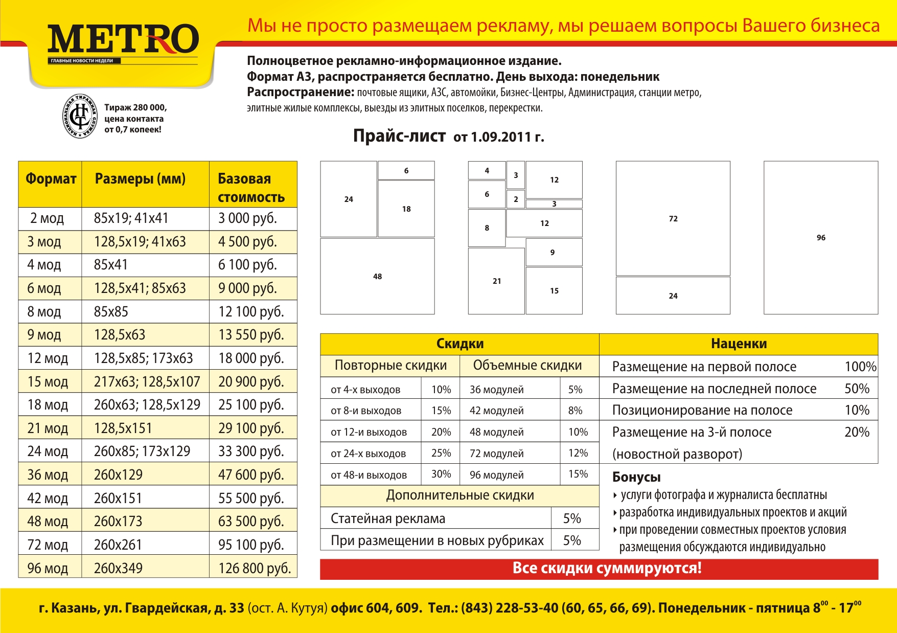 Газета "Метро. Главные новости недели" - это еженедельное бесплатное полноцветное издание формата А3. Это 20 полос, наполненных городскими новостями, эксклюзивными авторскими материалами на волнующие жителей Казани темы: новости Политики и Бизнеса, Финансы, Социальные проблемы, Образование, Авто, Здоровье, Моя Семья, Модный дом и многое другое.